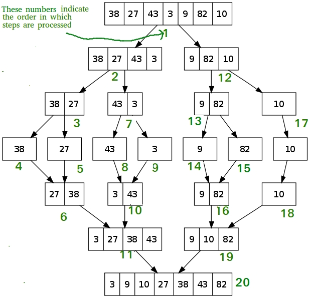 Call merge(arr, l, m, r)The following diagram fromwikipediashows the complete merge sort process for an example array {38, 27, 43, 3, 9, 82, 10}. If we take a closer look at the diagram, we can see that the array is recursively divided in two halves till the size becomes 1. Once the size becomes 1, the merge processes comes into action and starts merging arrays back till the complete array is merged.